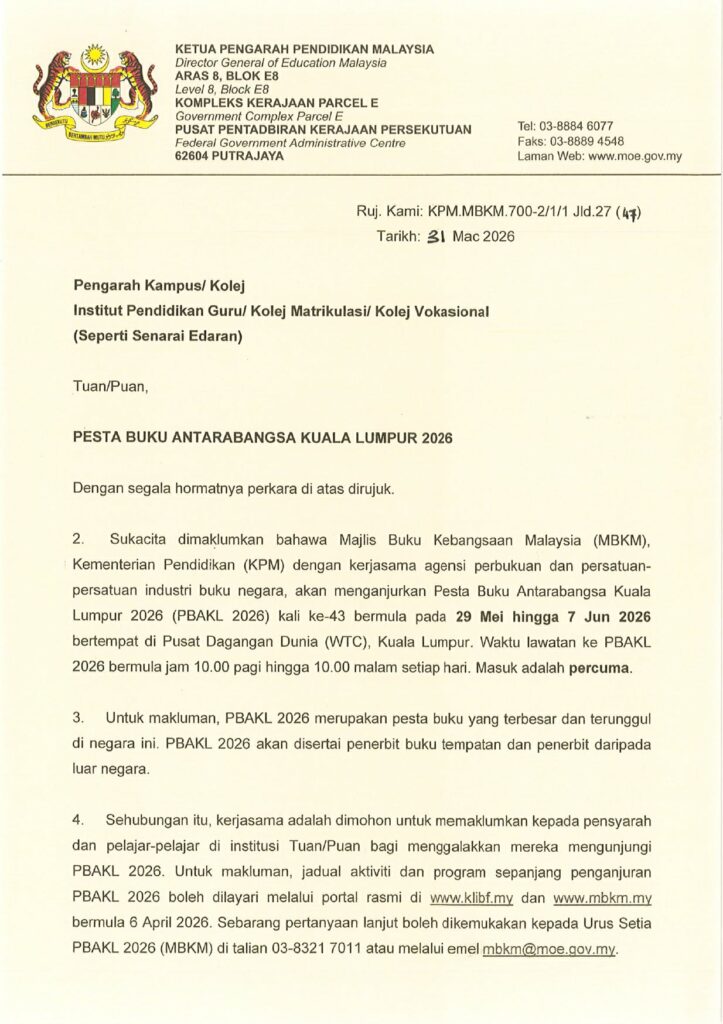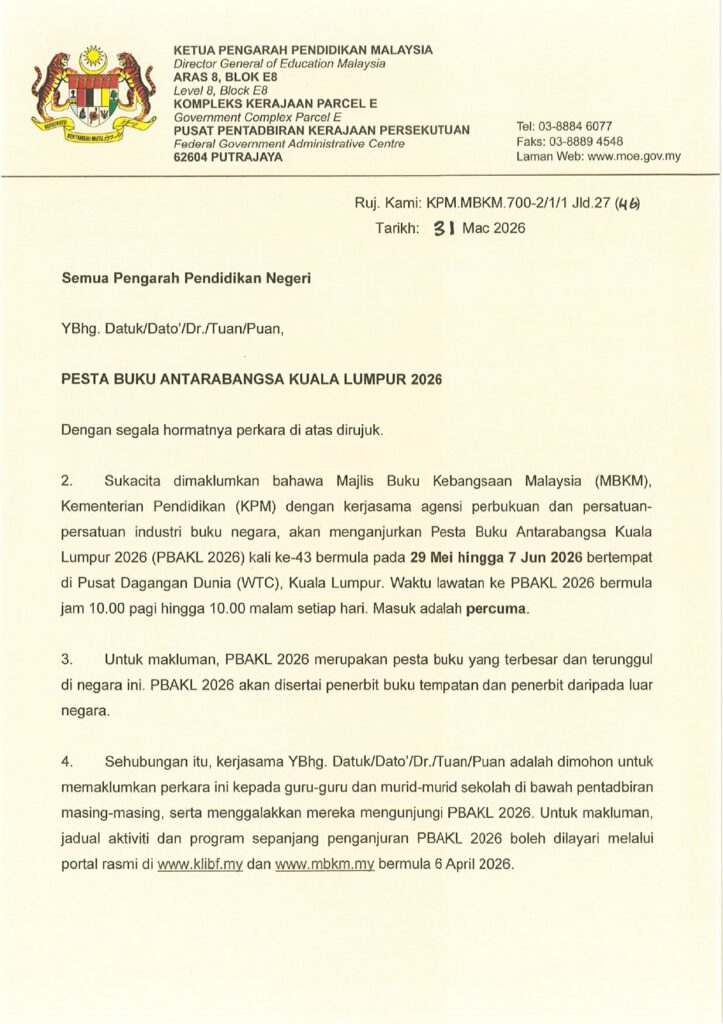 Surat hebahan untuk Pesta Buku Antarabangsa Kuala Lumpur 2026 kepada sekolah-sekolah boleh dimuat turun di sini;